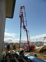 コンクリートを打設するための圧送車(ポンプ車)が、校舎増築工事現場に登場です。