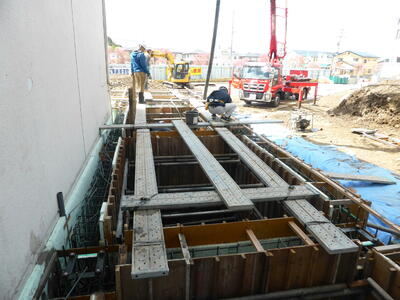 27日は、現校舎と増築校舎を結ぶ渡り廊下のコンクリート打設が行われました。キリンのように長い首(アーム)につながった、ゾウの鼻(ホース)を通して、コンクリートが型枠に流し込まれていきます。休み時間には、その工事の様子を、興味深そうに見つめる生徒の姿も多く見られました。