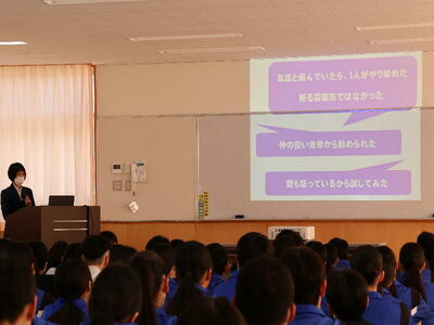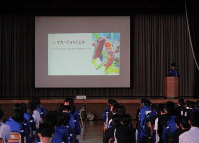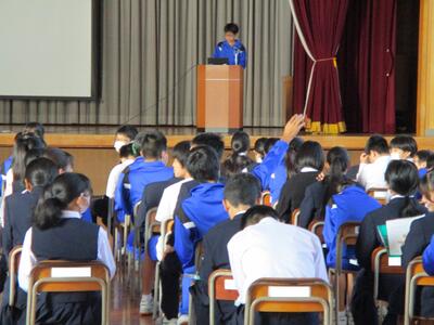 発表者は、緊張しながらも自分で調査してきたことに自信を持って発表し、他の生徒もその発表に耳と心を傾けて、真剣に聞いていました。