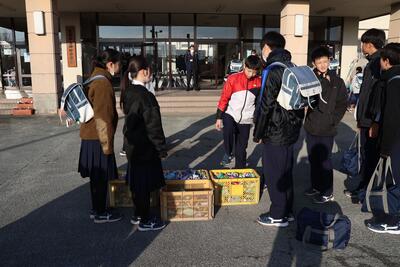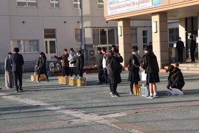 登校時のさわやかなあいさつが飛び交う昇降口前で、たくさんの生徒がアルミ缶回収に参加しました。