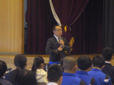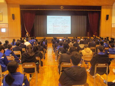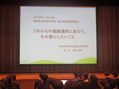 大沼先生からは、今年度の山形県公立高等学校入学選抜試験から導入される「前期日程・後期日程」についてのお話や近年の入試問題の特徴、また二学年の生徒が今後進路を選択する際にどんなことを考え、準備すべきかについて、丁寧にご説明いただきました。